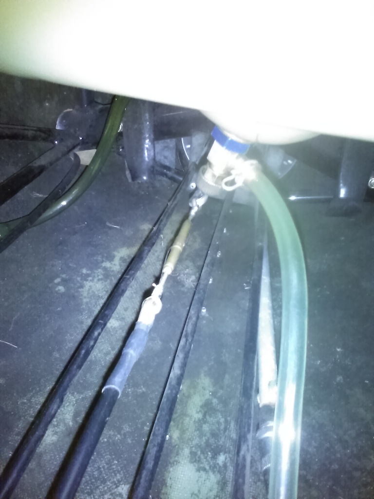 Here are some photos of my work on tightening the stabilatorcable. Earlier Mark B helped me identify the lazy stab when I described my lessthan spiffy lift offs. I dived into thisand put a half gallon of water on the trailing edge and to check cable tension.Then I removed the seat and got busy to tighten up the rear turnbuckle. Flown once since tightening. (Not enough history so far to be reporting butI did have a total of maybe 10 take offs and landings (some being air hopsinitally)). Now I have no movement with thehalf gallon water when the back stick is parked against the stop (using afabric strap to hold stick back for test). I do not quite understand all aboutturnbuckles in that guidance says not more than three threads showing each end.It seems to me that the ends are able to turn in to the buckle so that nothreads show and even will recede into the buckle further (sort of like negativethreads showing) which allows more travel than I was expecting (a good thing). Also, it seems that I may have had too muchtension on the other cable (now reduced) such that a sort of “pre-tension”existed that worked causing the half gallon to move the stabilator “pre-emptively”. Comments (except from Rahul) welcomed.